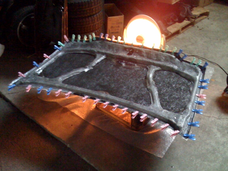 1プライ目が硬化したら、補強用にガラスマットを積層、この補強層を接着剤代わりにして裏骨をのせて圧着。